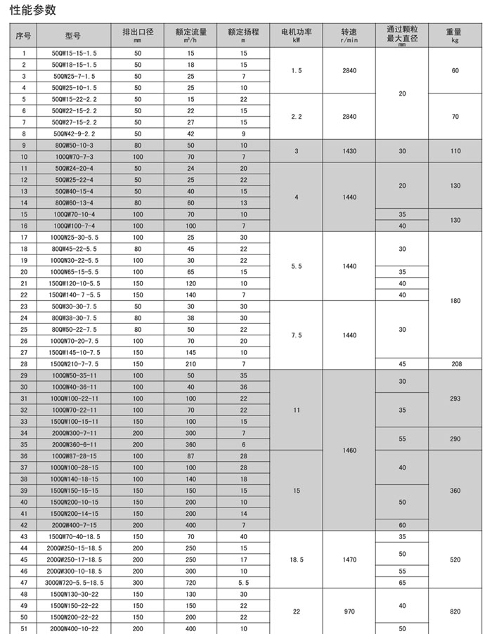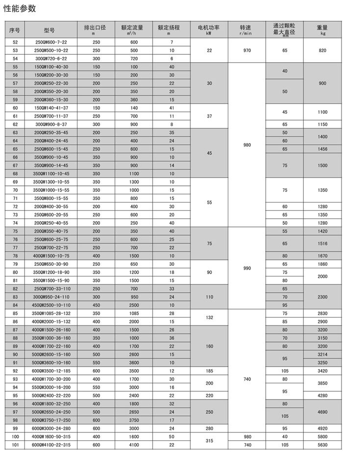 該系列泵排出水口徑為50—600mm,流量10~7000m3/h,揚(yáng)程為5~60m, 功率為1.5~315KW,通過固體顆粒直徑為20~145mm。