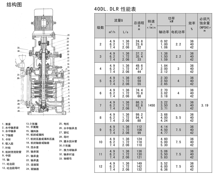 DL系列泵是立式、單吸、多級(jí)、分段式離心泵,供輸送清水及物理化學(xué)性質(zhì)類似于水的80℃以下的液體之用。DLR型熱水泵輸送介質(zhì)溫度為150℃以下。泵為立式安裝,具有結(jié)構(gòu)緊湊、噪音低,占地面積小等特點(diǎn),主要應(yīng)用于城鎮(zhèn)供水及集中供熱系統(tǒng)。