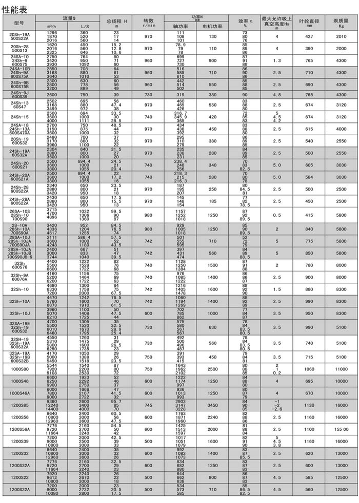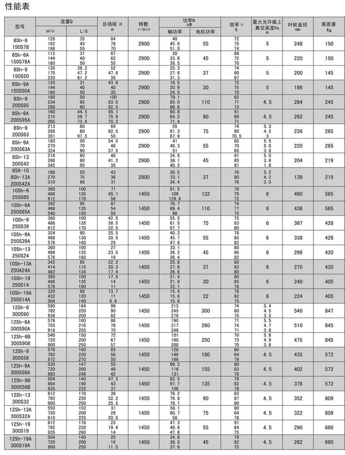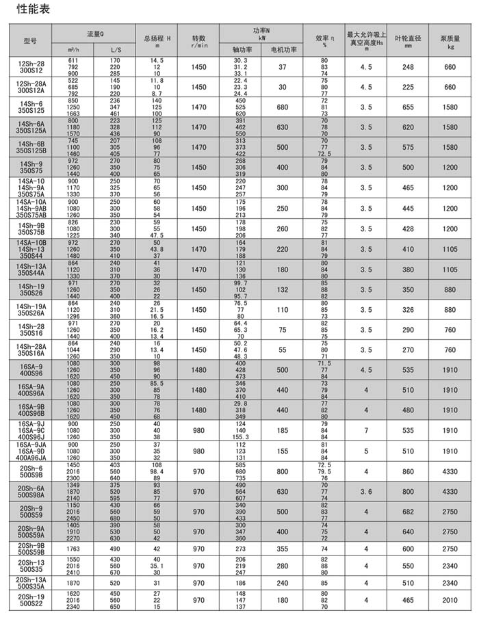 Sh.S.SA型泵是單級,雙吸,泵殼水平中開式離心泵,供輸送清水及物理化學(xué)性質(zhì)類似于水的液體之用。介質(zhì)溫度80℃,若兩端軸承通以冷卻水,介質(zhì)可達(dá)130℃。改變?nèi)~輪,密封環(huán)和軸封的材料,可以汲送含有泥沙的渾水,泵的軸封一般采用軟填料,如有特殊訂貨要求,也可裝機(jī)械密封。